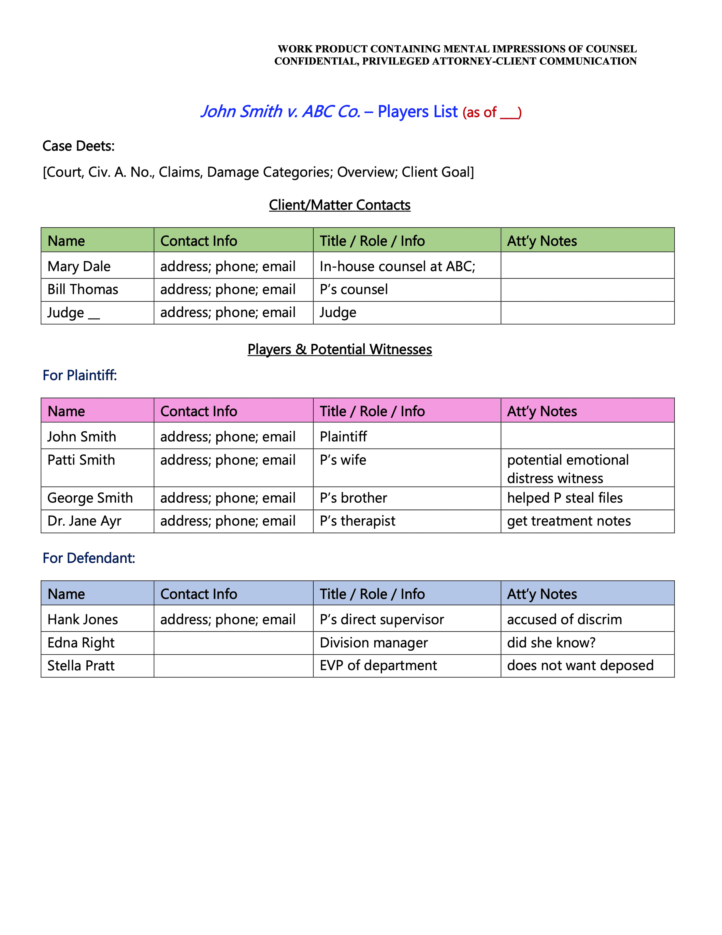 Eventually the list got subcategories for witnesses, corporate representatives, opposing counsel, the judge and clerks, and any other people whom I might need to contact for the case.