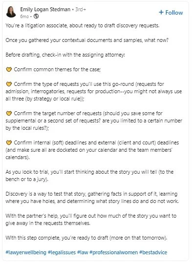 If you have any inclination toward litigation, her posts should be a great resource for you. They also are helpful for new associates.