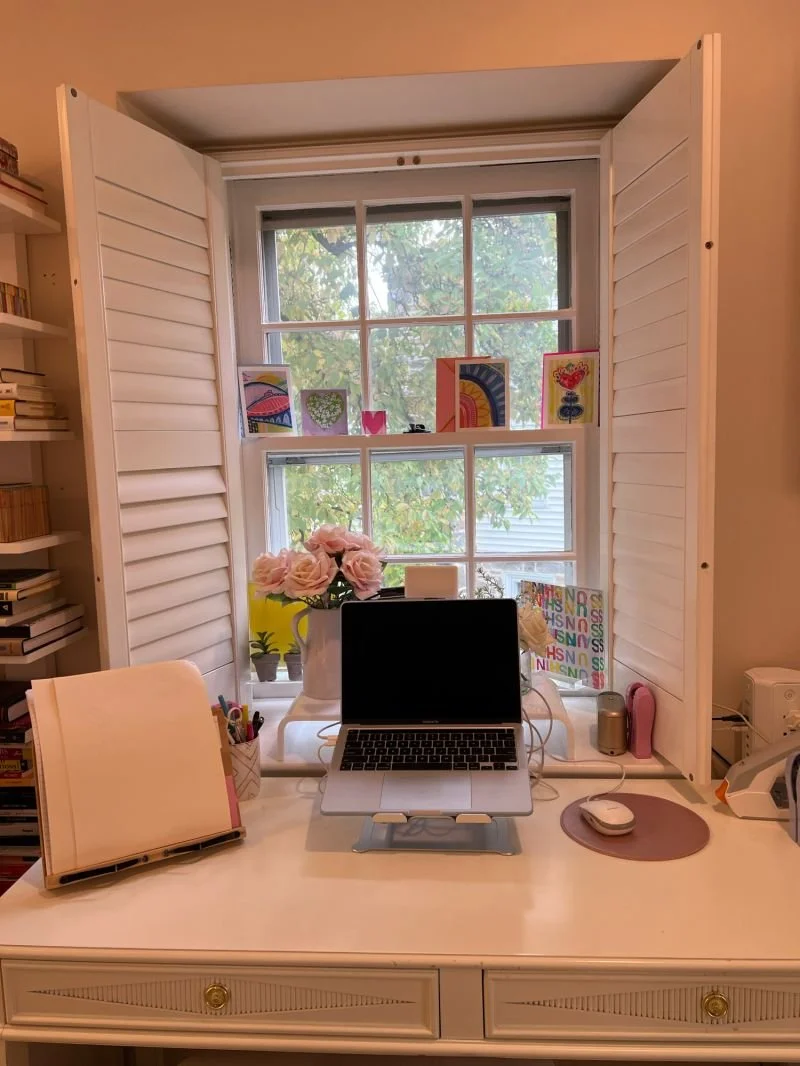 🔸 Surrounding my workspace with cheerful, colorful images. Pictured is my desk.