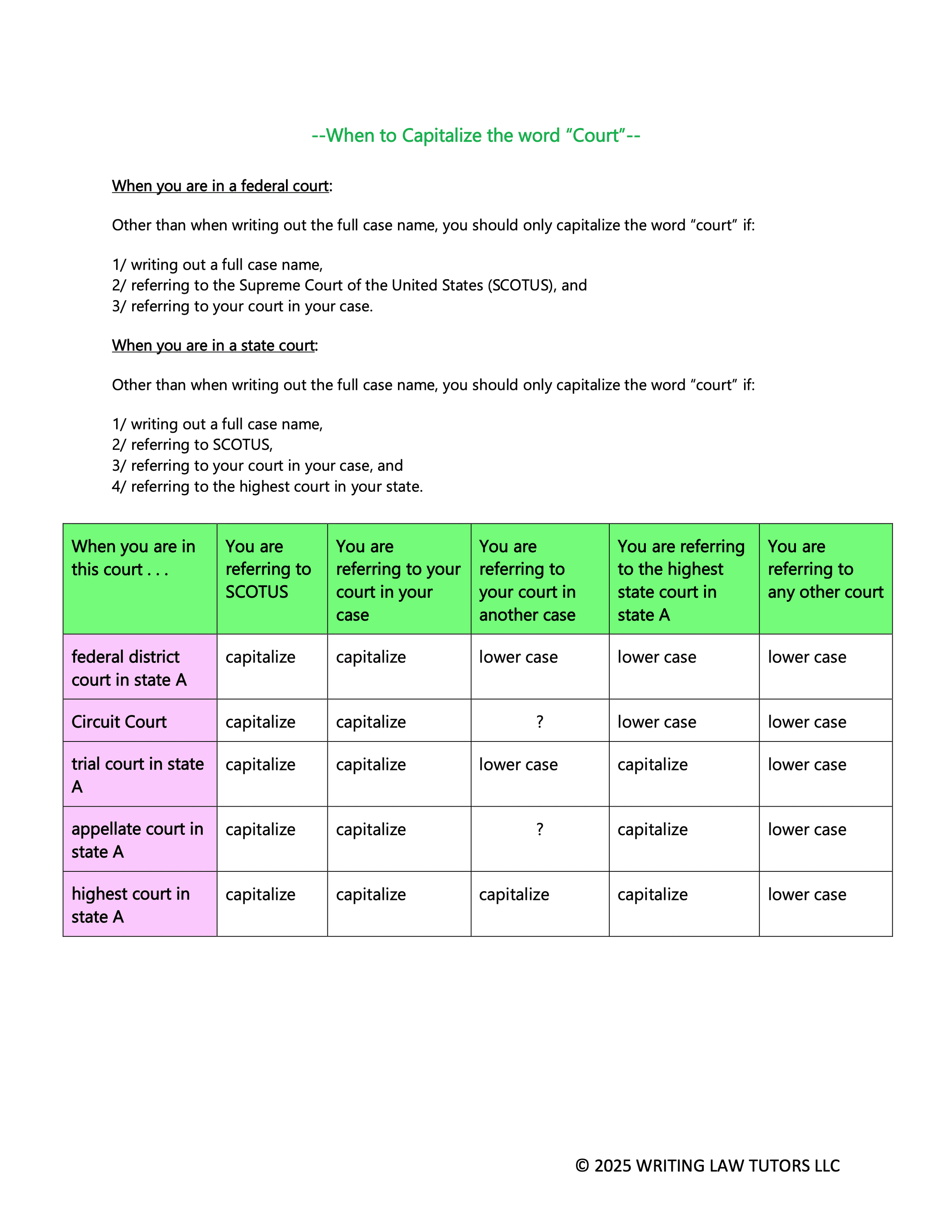 *N.B. There are 2 question marks in the attached chart. I would write “lowercase” there, but some lawyers have a different practice, so I advise you to ask your professor specifically what they want in those two situations.