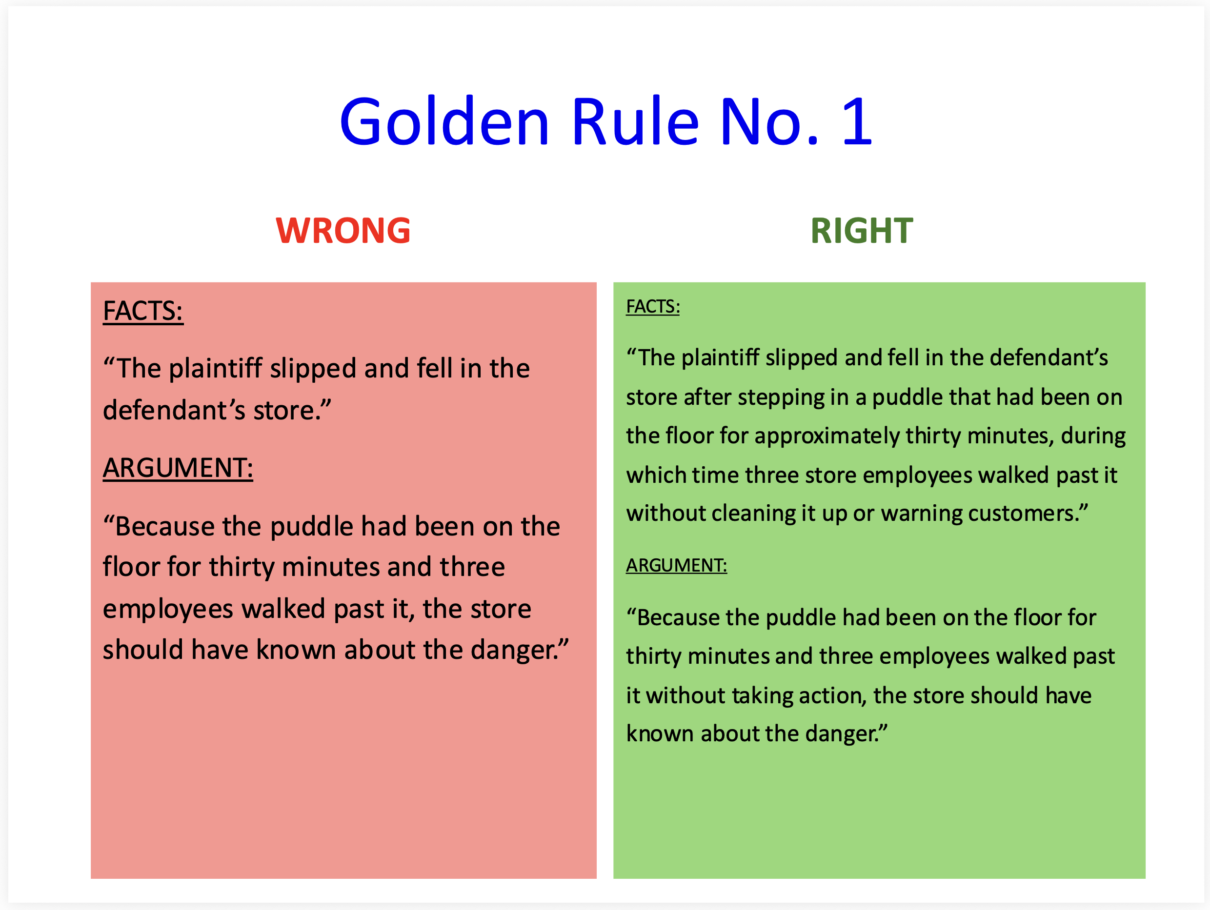Every fact and other relevant detail about a case needs to be explained in a non-argumentative way (in the “E” part of CREAC).
